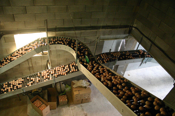 Ouăle sunt transportate ușor și sigur din diferite rânduri de cuibare, sau hale, la o locație centrală a fermei.